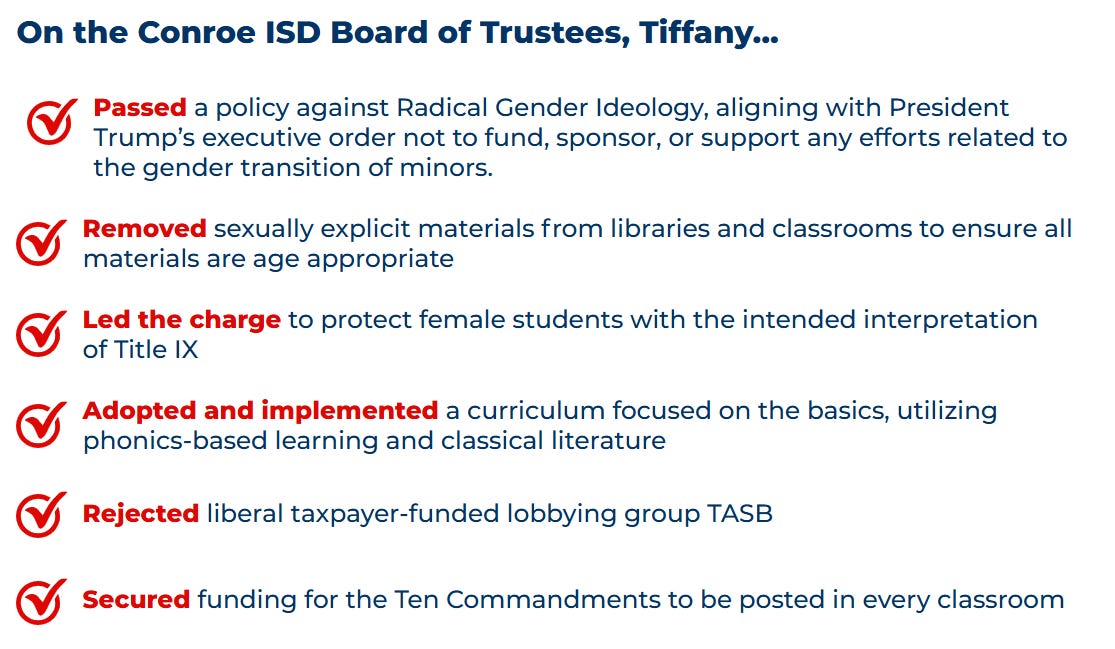 This gives support to the reasoning why the school board has pushed to pass so many ideological policy and curriculum changes so quickly, as Tiffany needed the “wins” as part of her platform to run for SBOE. This included her personally securing $6,000 (from a private source) of the $7,500 in funds spent for 10 Commandment posters for all of Conroe ISD, which was somehow pushed through the district without board approval in a public meeting. This decision included the decision to put the posters on the walls, which are now being taken down.2