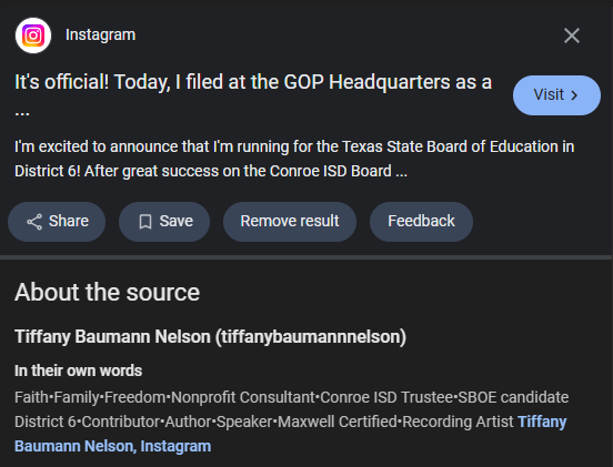 For anyone that follows our local school board you know that one of our school board trustees, Tiffany Nelson, launched a campaign to run for the State Board of Education (SBOE).