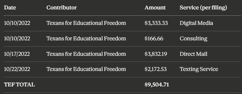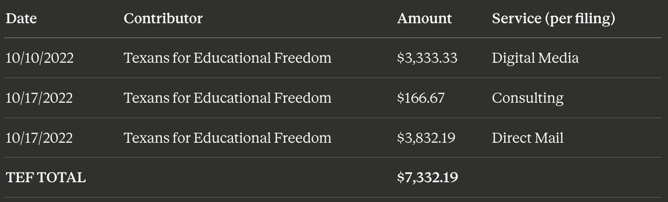 According to Texas Ethics Commission filings reviewed by the Texas Observer, CAZ Consulting and its subsidiary Tripple Threat Strategies have done campaign work almost exclusively for Texans for Educational Freedom, which had paid them more than $200,000 for school board consulting work as of October 2024.