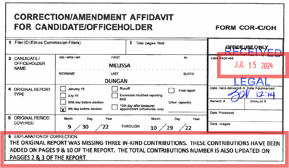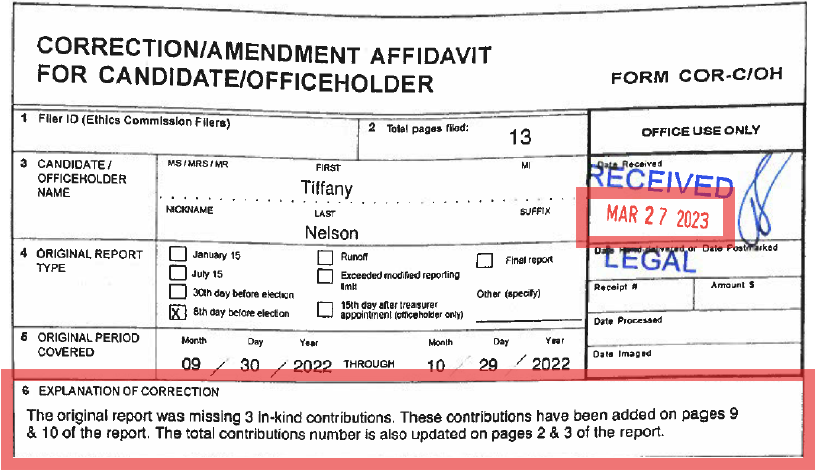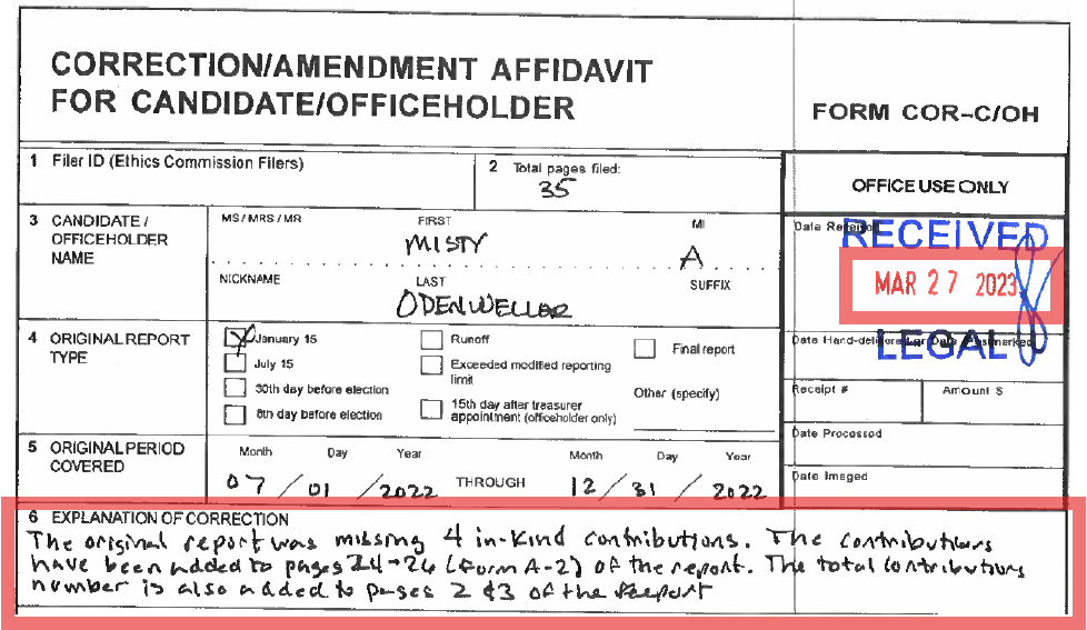 Odenweller's campaign amendment, filed March 27, 2023 (months after the required reporting period), also revealed multiple in-kind1 contributions from TEF that were missing from her original reports: