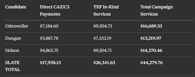 Campaign finance records filed with the Texas Ethics Commission document exactly how the CAZ/TEF network was embedded in all three campaigns.