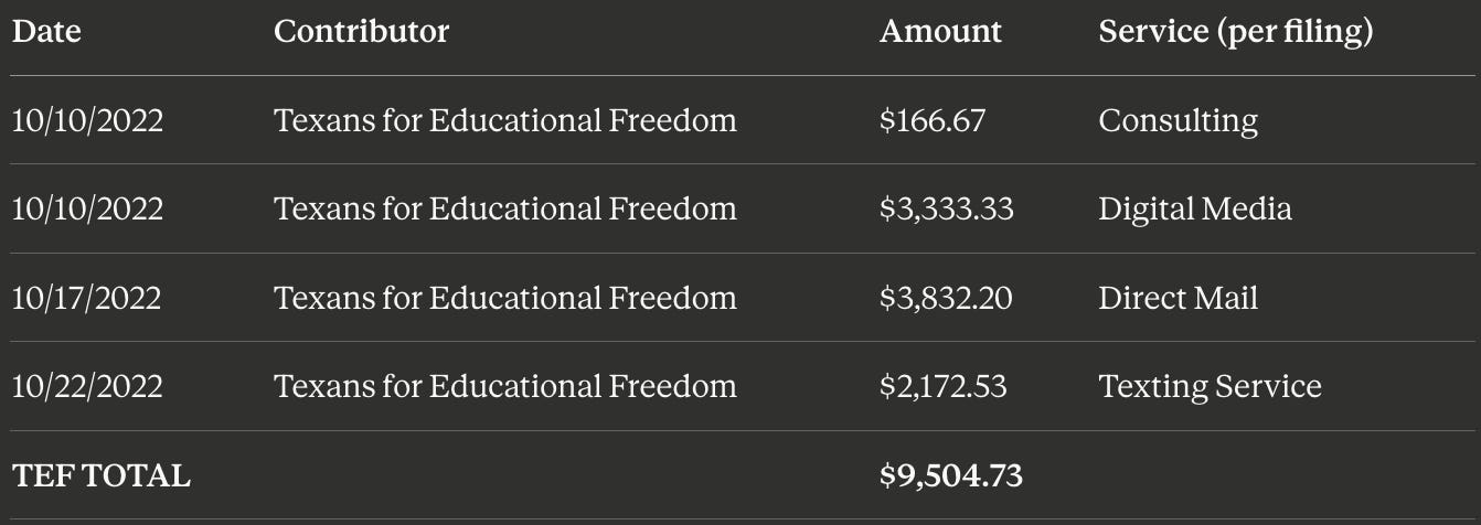 The network operating behind this has real resources, a real track record, and over $44,000 in documented spending just on the three 2022 CISD candidates. That number doesn’t include the 2024 slate: Nicole May, Lindsay Dawson, Melissa Semmler, and Marianne Horton, whose records tell their own story.