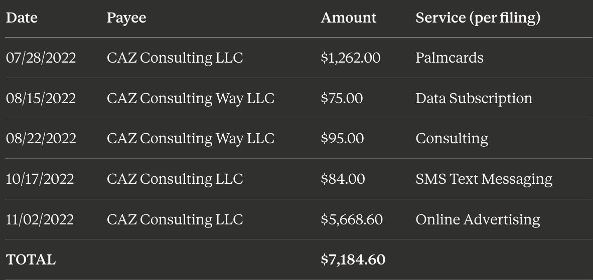 Over $44,000 in documented CAZ/TEF money flowed through the three 2022 Mama Bear campaigns, from a single consultant who founded the PAC in early 2021 and then launched his consulting firm seven months later to service it.