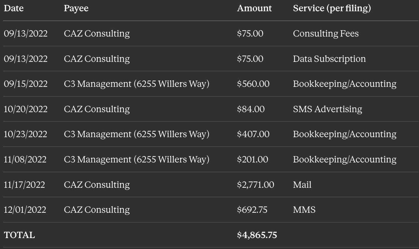 Nelson’s records show the most extensive TEF involvement of all three candidates. Across her 30-day report, her amended 8-day report, and her January 2023 post-election report, CAZ Consulting and C3 Management (same Willers Way address) appear repeatedly: