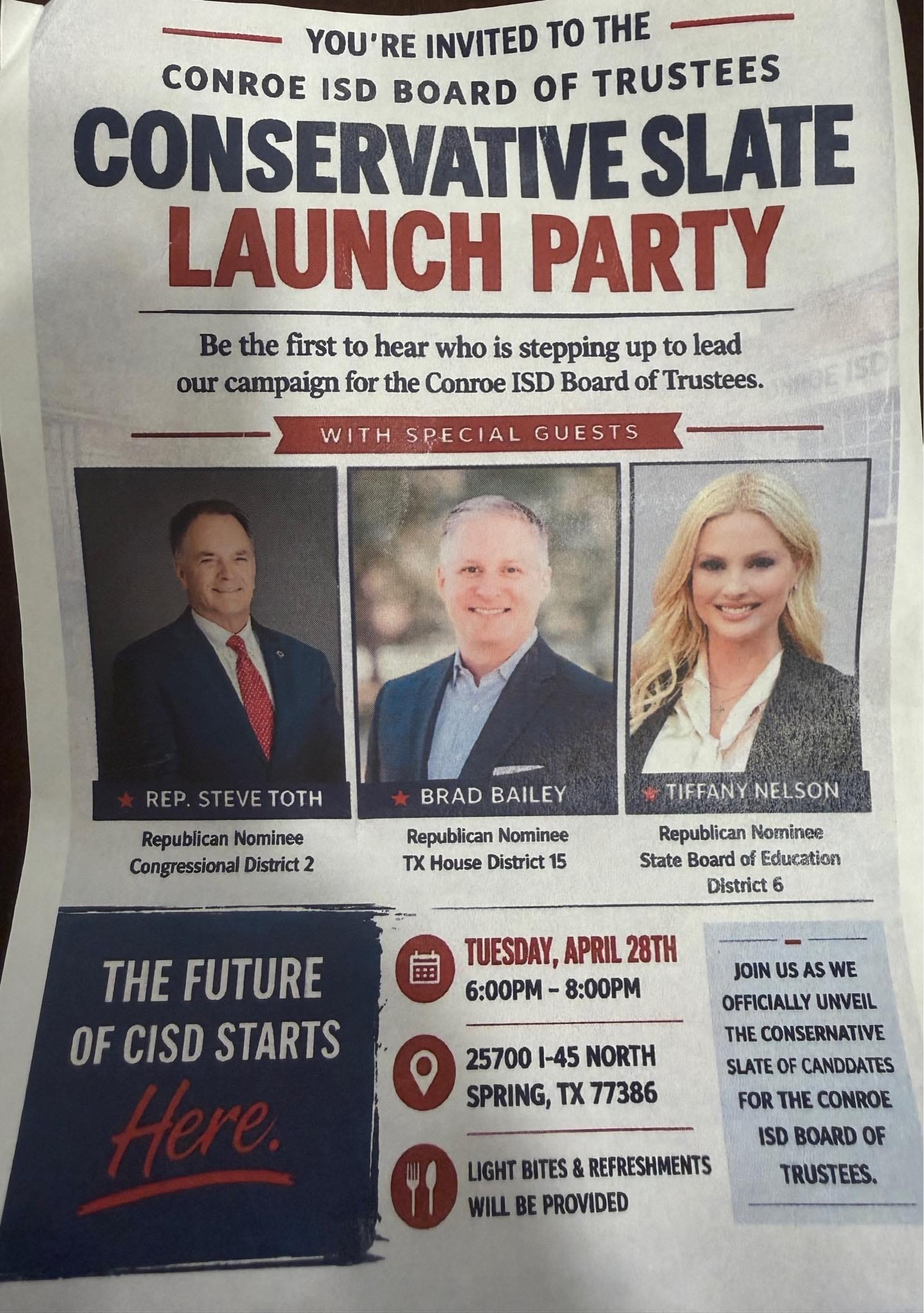 The push poll you received is asking how you feel about the current Conroe ISD board, but only after it tells you what to think about the current board. That’s the mechanism. It’s not subtle once you see it.