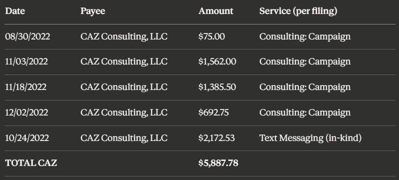 Odenweller’s post-election finance report covering July through December 2022 shows payments directly to CAZ Consulting LLC (6255 Willers Way, Houston TX 77057) and CAZ Consulting Way LLC (same address) for the following services as described in her own filings: