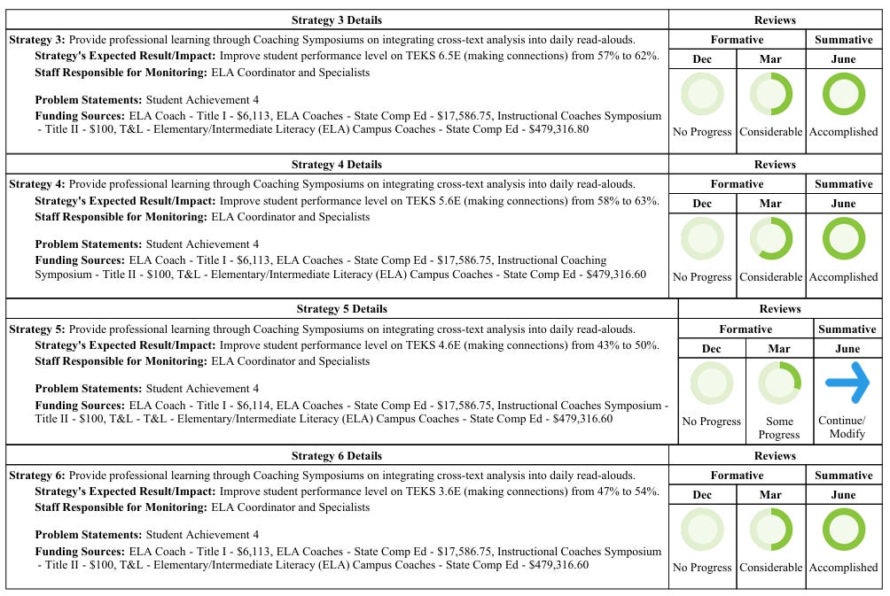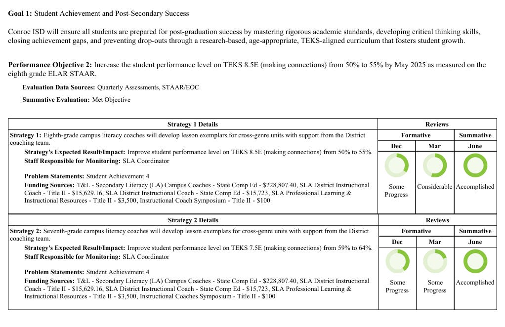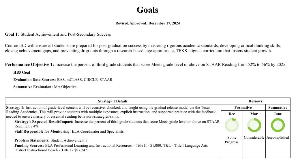 If you need your eyes to glaze over, I want you to go deep dive the CISD District Improvement Plan, which is published every year. If you want to see where the actual work is done, go give that a read. Here is an example: